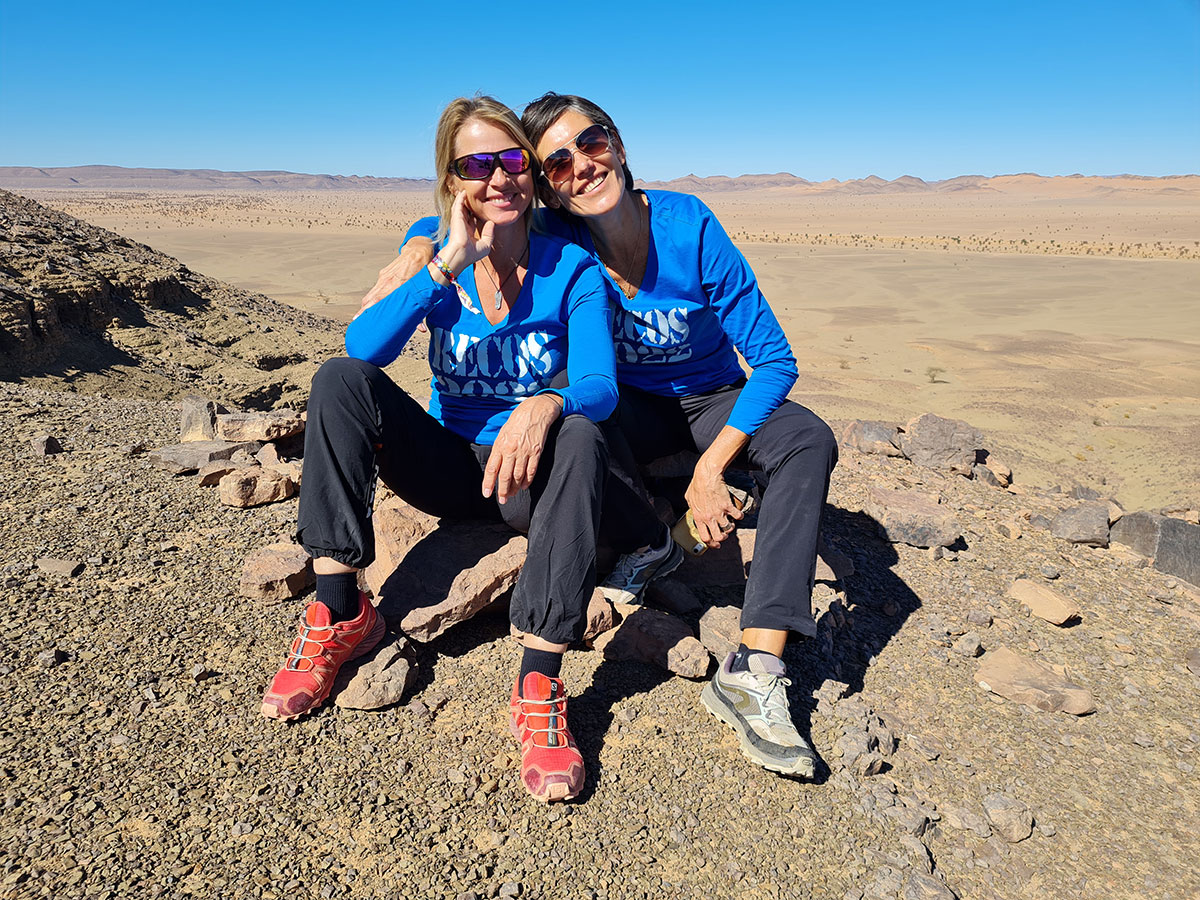 Enfin l'ultime étape des reconnaissances se fait à pied en conditions réelles. Corinne et Valérie se mettent dans la peau des trekkeuses et vont parcourir les 4 étapes en intégralité (défi compris). Elles partent de l'emplacement du bivouac avec leurs sacs à dos chargés de bouteilles d'eau, d'un téléphone satellite et bien sûr d'une carte et d'une boussole. L'objectif étant de s’assurer que les participantes peuvent faire les étapes sans danger, que le terrain est franchissable à pied.et que le parcours soit à la portée de tous les profils de trekkeuses, des plus aguerries aux plus débutantes. Cela permet également d’évaluer le temps passé sur le terrain pour chaque étape.